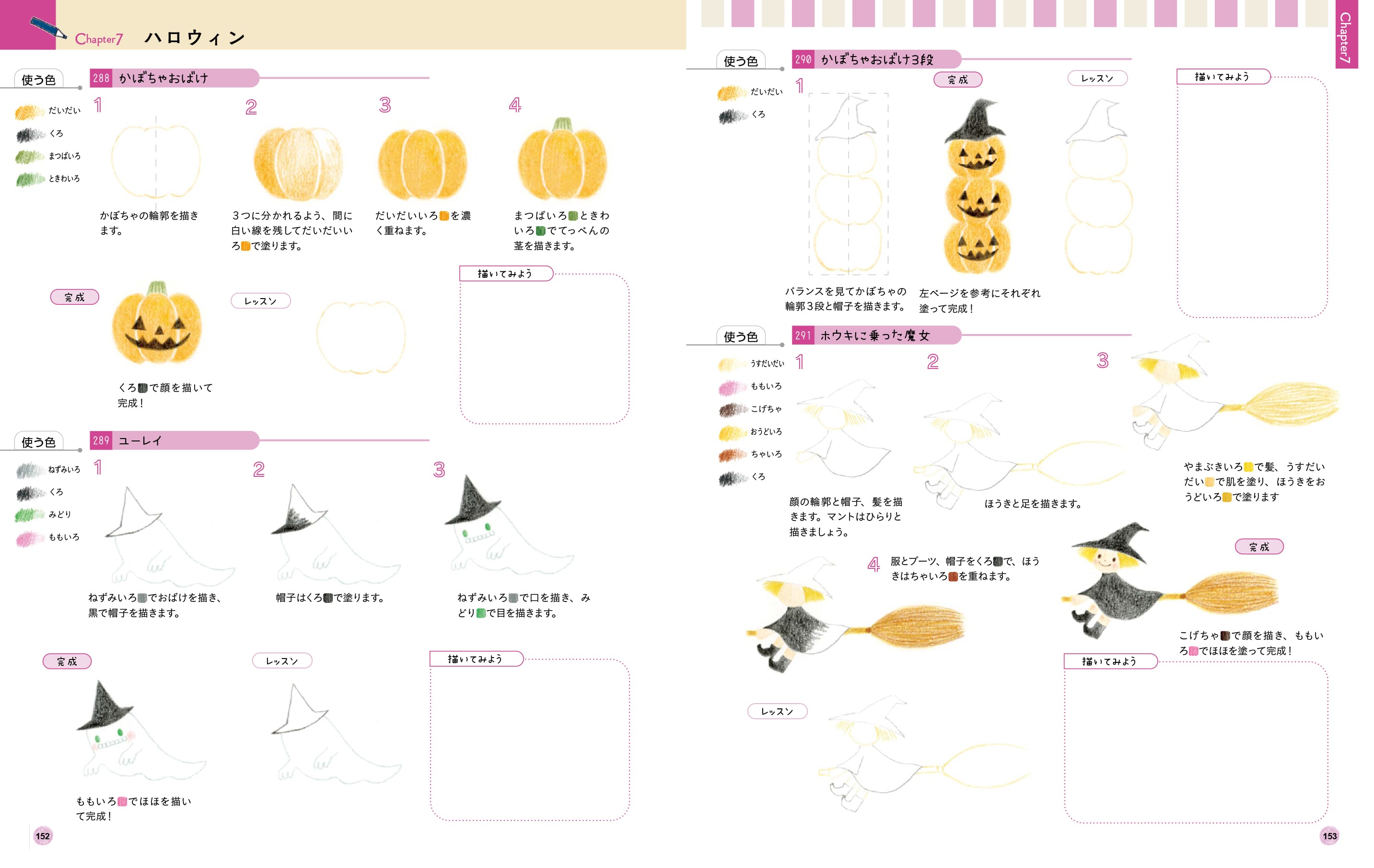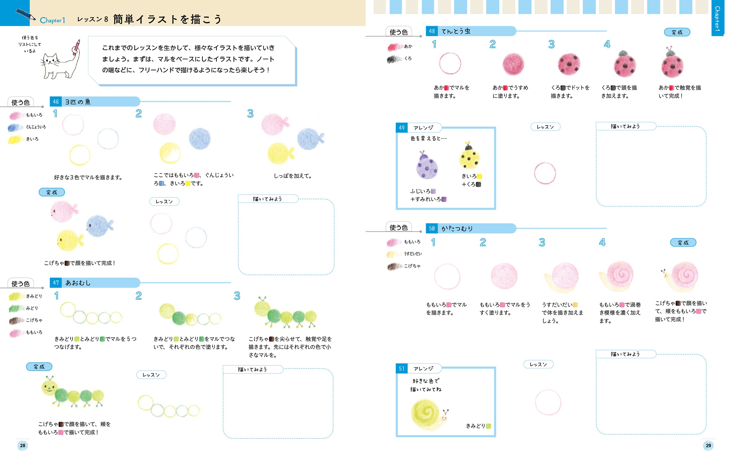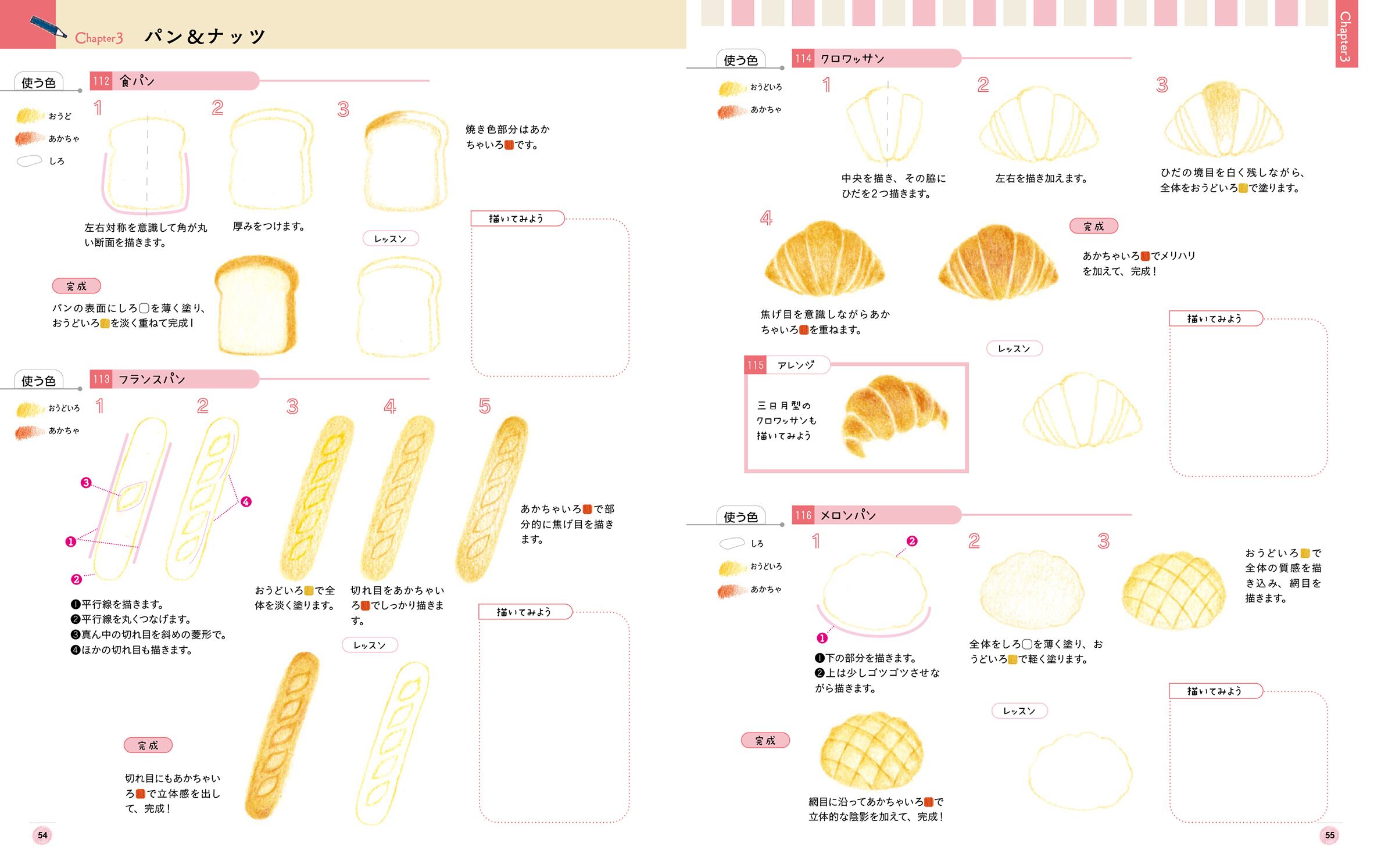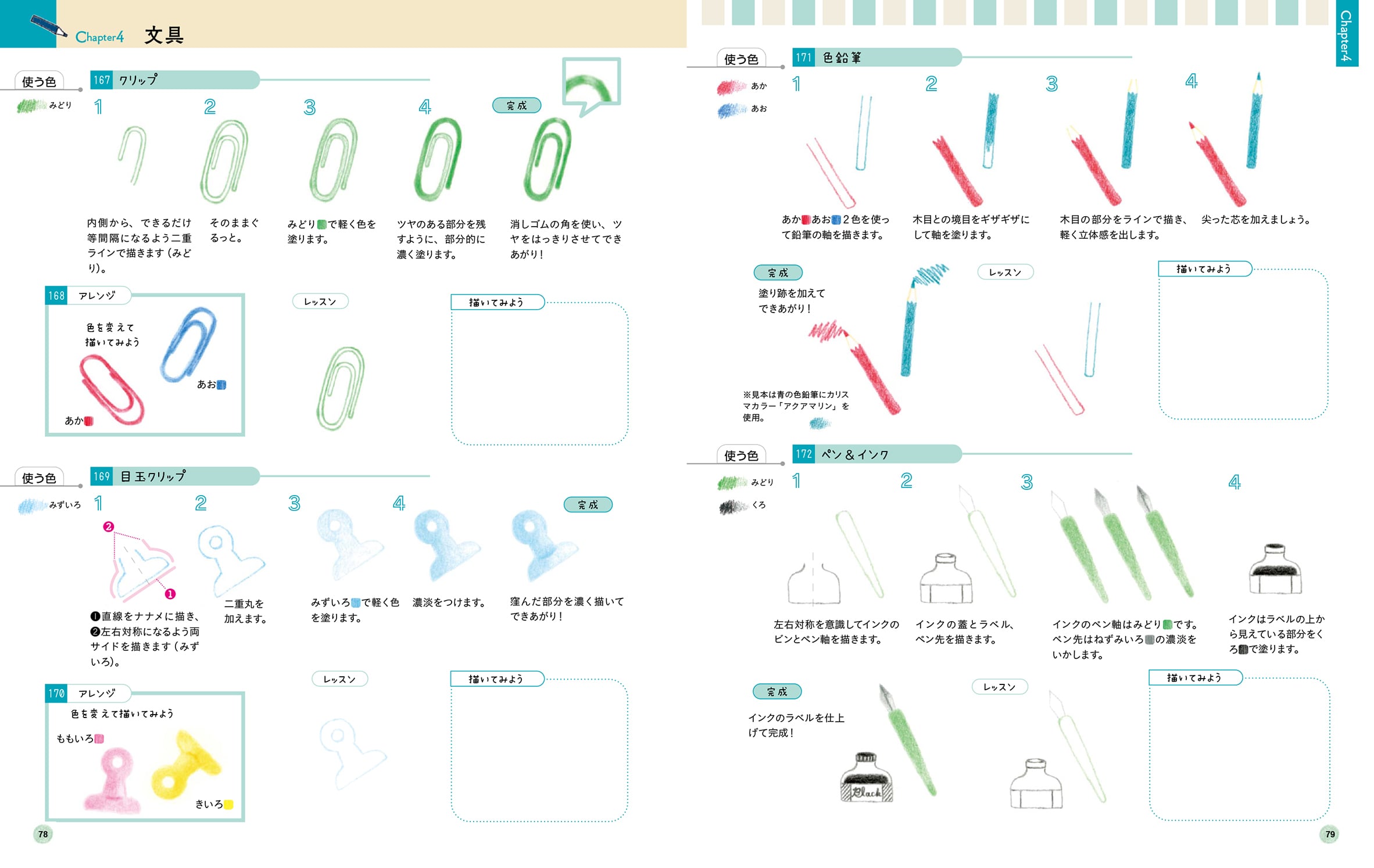 手順を確認したのちに、目安となる「レッスン線」を使って練習→白紙に描いてみる、という2段階の描き込み式レッスンによって、自分で描く力がついていきます。