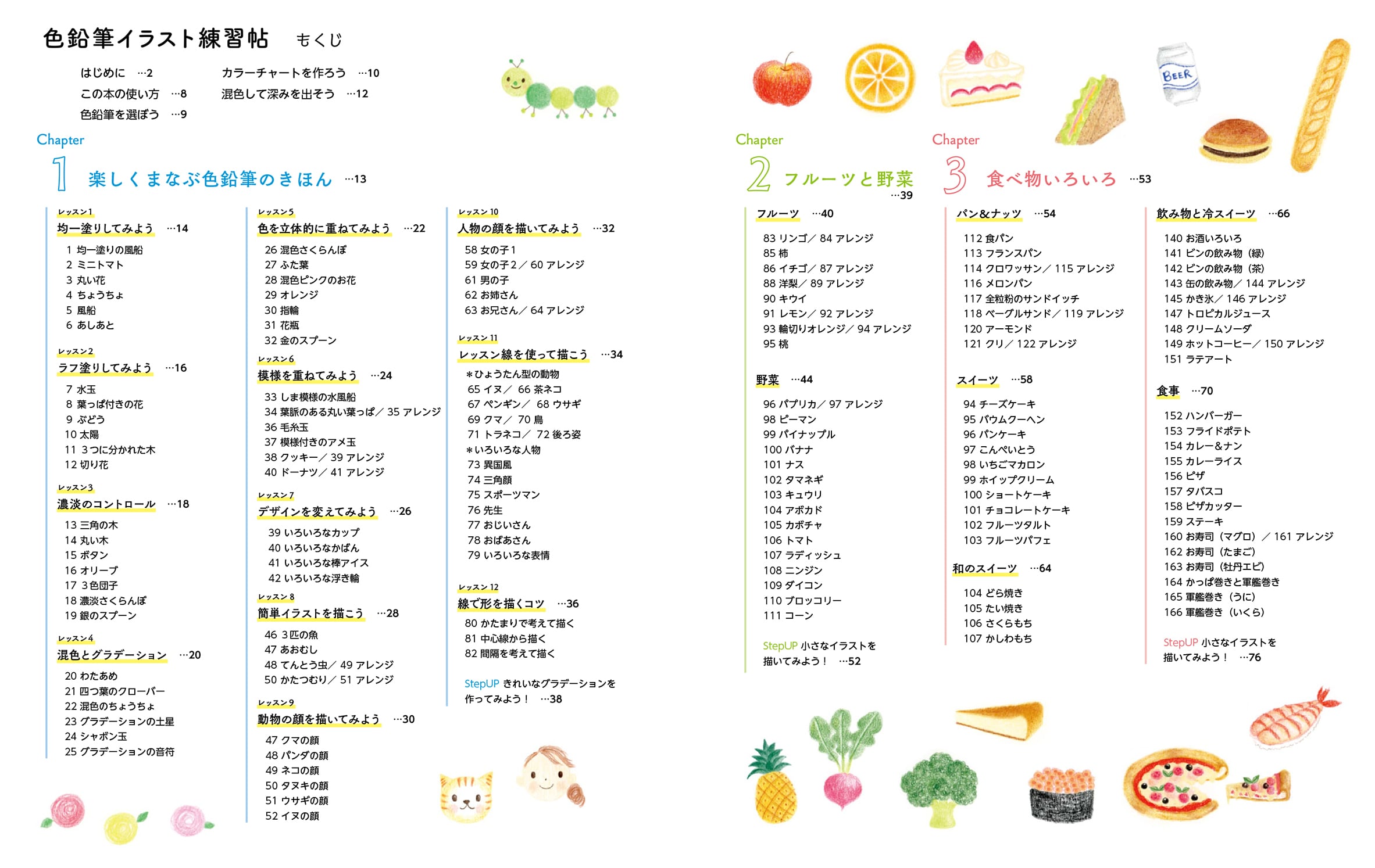 人物、生き物、植物、雑貨など、色鉛筆で描いたかわいいイラスト約300点。目安となる「レッスン線」を使ってお気に入りを描こう。