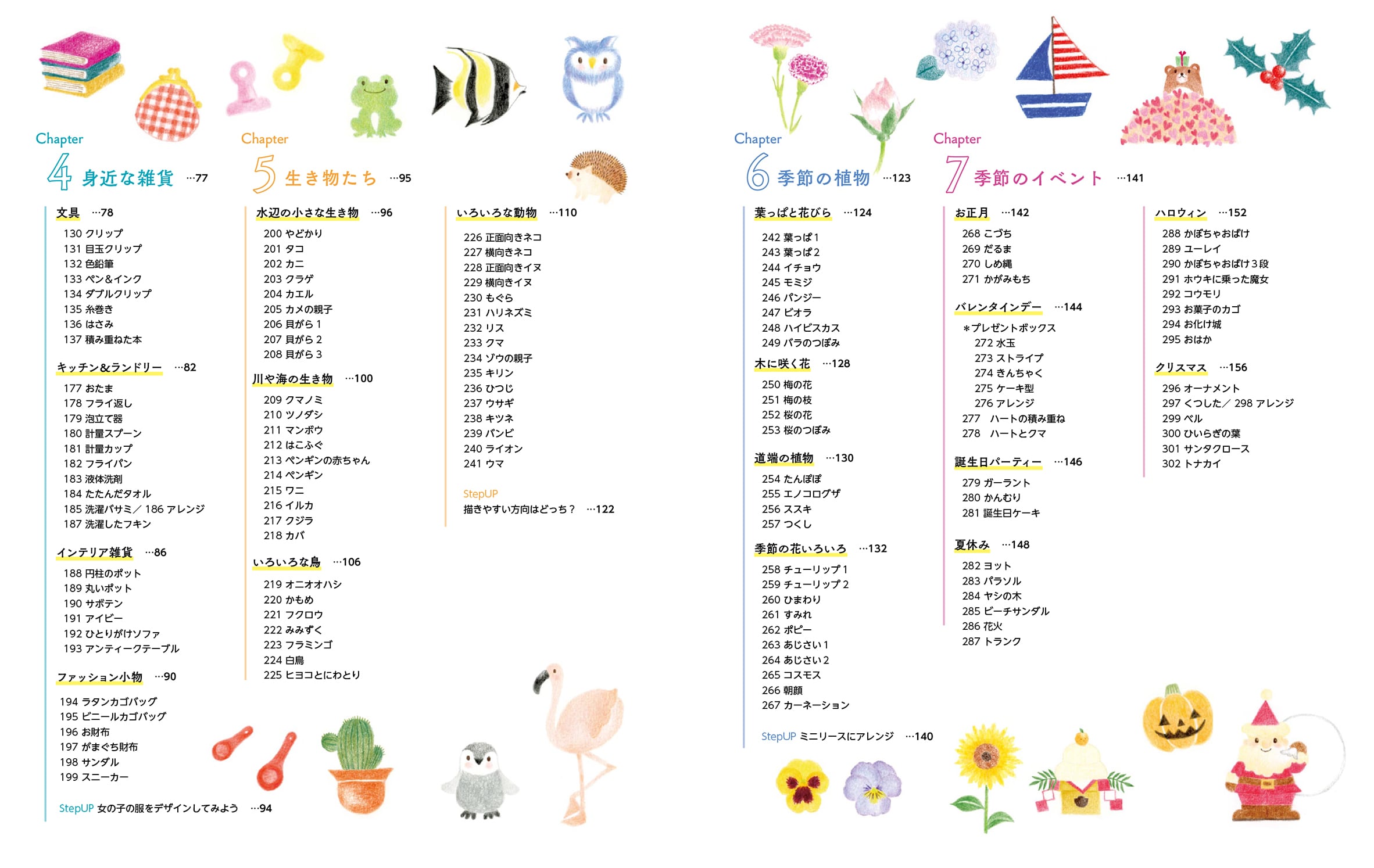 人物、野菜や果物、海の生き物、動物たち、植物、雑貨、ハロウィン&クリスマスなど、内容は盛りだくさん。どれもナチュラルで真似しやすいイラストです。